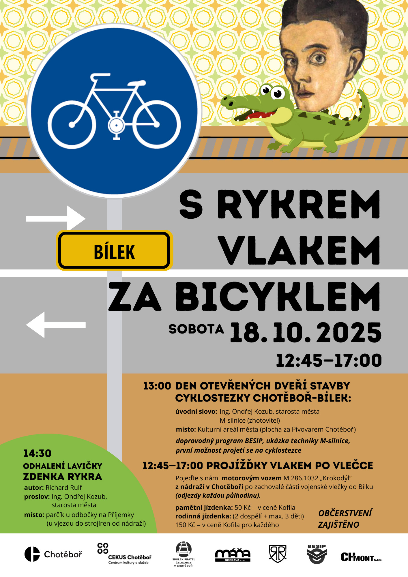 V sobotu 18. října 2025 pořádá městská kulturní organizace CEKUS Chotěboř v úzké spolupráci s městem Chotěboř, Spolkem přátel železnice v Chotěboři a dalšími subjekty a partnery celoodpolední akci se zajímavým názvem S Rykrem vlakem za bicyklem. V tento den budete mít v prvé řadě po více než čtyřech letech ojedinělou příležitost svézt se po zachovalé části vojenské vlečky Chotěboř – Bílek, a to motorovým vozem M 286.1032 Krokodýl brněnského spolku Hrbatá Máňa. Jezdit se bude z chotěbořského nádraží každých 30 minut od 12.45 hodin (první jízda) do 16.45 (poslední jízda). Projížďka vám mimo jiné umožní prohlédnout si z okénka vlaku část již prakticky hotové cyklostezky Chotěboř – Bílek, na níž se od 13.00 hodin uskuteční Den otevřených dveří stavby, během nějž bude možné se seznámit se stavbou (promluví o ní starosta města Chotěboře Ing. Ondřej Kozub a zástupce zhotovitelské firmy M-Silnice) a po části cyklostezky se projet či projít. Připraven je též doprovodný program (prezentace techniky firmy M-Silnice a aktivity BESIPu) a též občerstvení. Vše v Kulturním areálu města Chotěboř (za Pivovarem Chotěboř). Jízdenka na projížďku po vlečce stojí 50 Kč a rodinná jízdenka (max. 2 dospělí a 3 děti) 150 Kč. V ceně je pamětní lepenková jízdenka a čokoládová tyčinka Kofila pro každého cestujícího. Proč právě Kofila? Protože součástí dění v sobotu 18. října odpoledne je i odhalení lavičky rodáka z chotěbořského nádraží, výtvarníka a publicisty PhDr. Zdenka Rykra, který je tvůrcem obalu na Kofilu a také známé čokoládové hvězdy Orion. Letos uplyne 125 let od jeho narození, a proto mu bude v parčíku v těsné blízkosti chotěbořského nádraží (u odbočky na Příjemky) odhalena lavička od uměleckého kováře Richarda Rulfa z Chotěboře. Slavnostní odhalení lavičky za účasti starosty města proběhne ve 14.30 hodin. Lavičku nechalo pořídit město Chotěboř s finančním přispěním firmy CH-Mont, s. r. o., chotěbořského radního Jindřicha Pospíchala. Přijďte tedy v sobotu 18. října 2025 na nádraží či k pivovaru na cyklostezku a určitě nevynechte jízdy Krokodýlem. Mimo jiné proto, že tradiční Mikulášská mašinka si letos dopřeje pauzu. Těšíme se na vás!